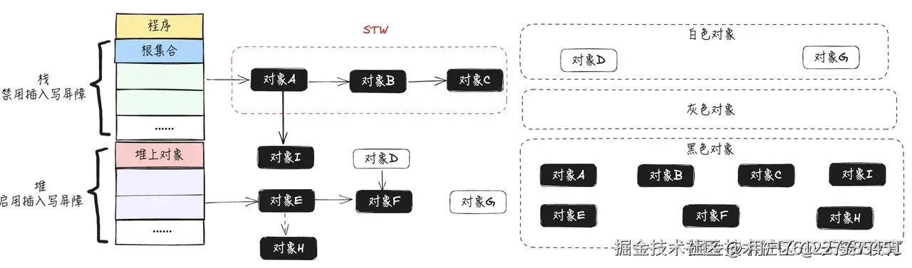 - GC 开始将栈上的对象全部扫描并标记为黑色(注意是一个一个栈标记,不是所有栈全部暂停标记)