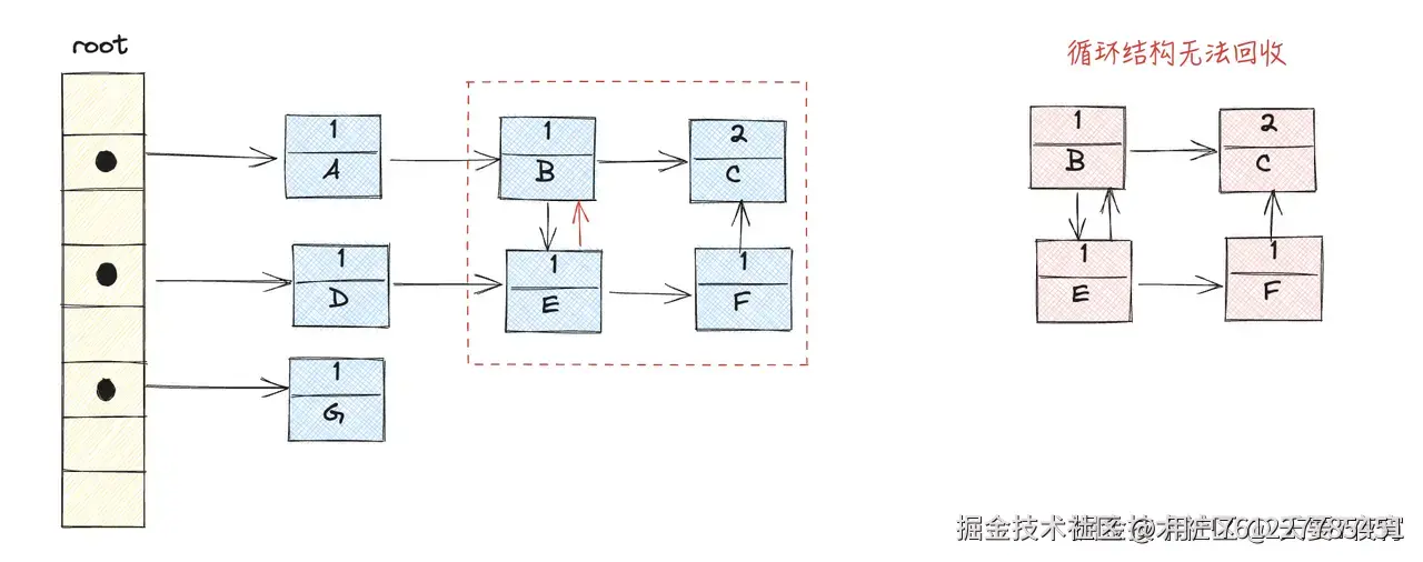 比如上图,再删除了对象A和D之后,由于对象B和E之间存在循环引用,所以上下B,C,E,F四个对象都存再引用关系,计数都不为0,所以都不能被回收,如果大量存在这种循环对象的话,就会造成一定的内存泄漏