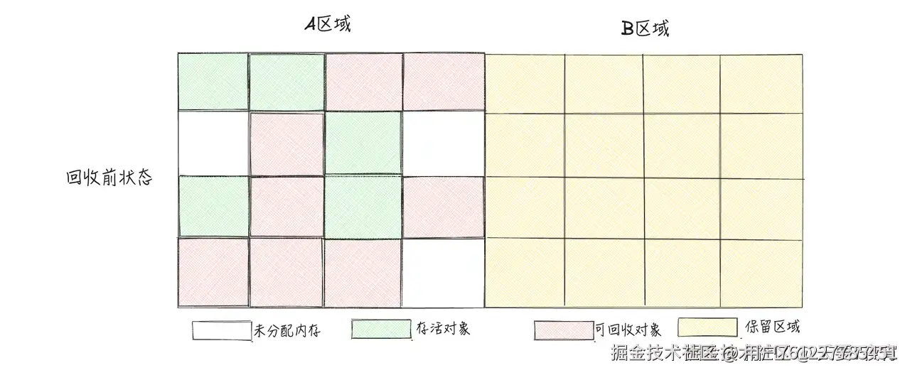 复制算法将内存分成两个相等的区域,并且一次只使用其中一个。当这个区域被用完时,程序会把所有还在使用的对象复制到另一个空区域(保留区域),然后将已使用的区域全部清除。