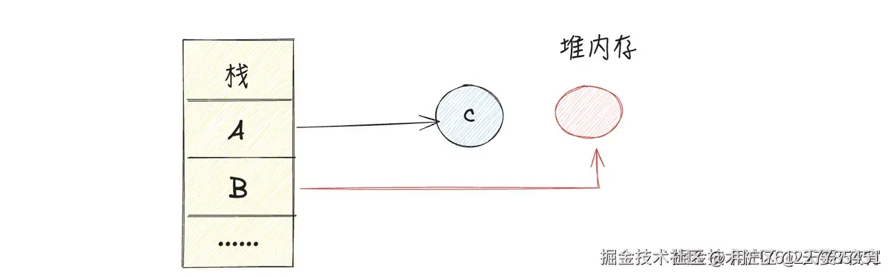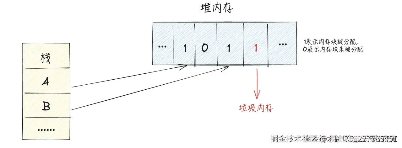 如上图所示,红色1标示的堆内存块就是垃圾内存,需要被回收清理,因为这块内存已经被分配,但是并没被使用,而剩下的两个黑色1标示的堆内存块不能被gc回收,因为还有两个栈上对象指向他们,它们还处于被引用状态中,处于使用阶段,不是垃圾内存