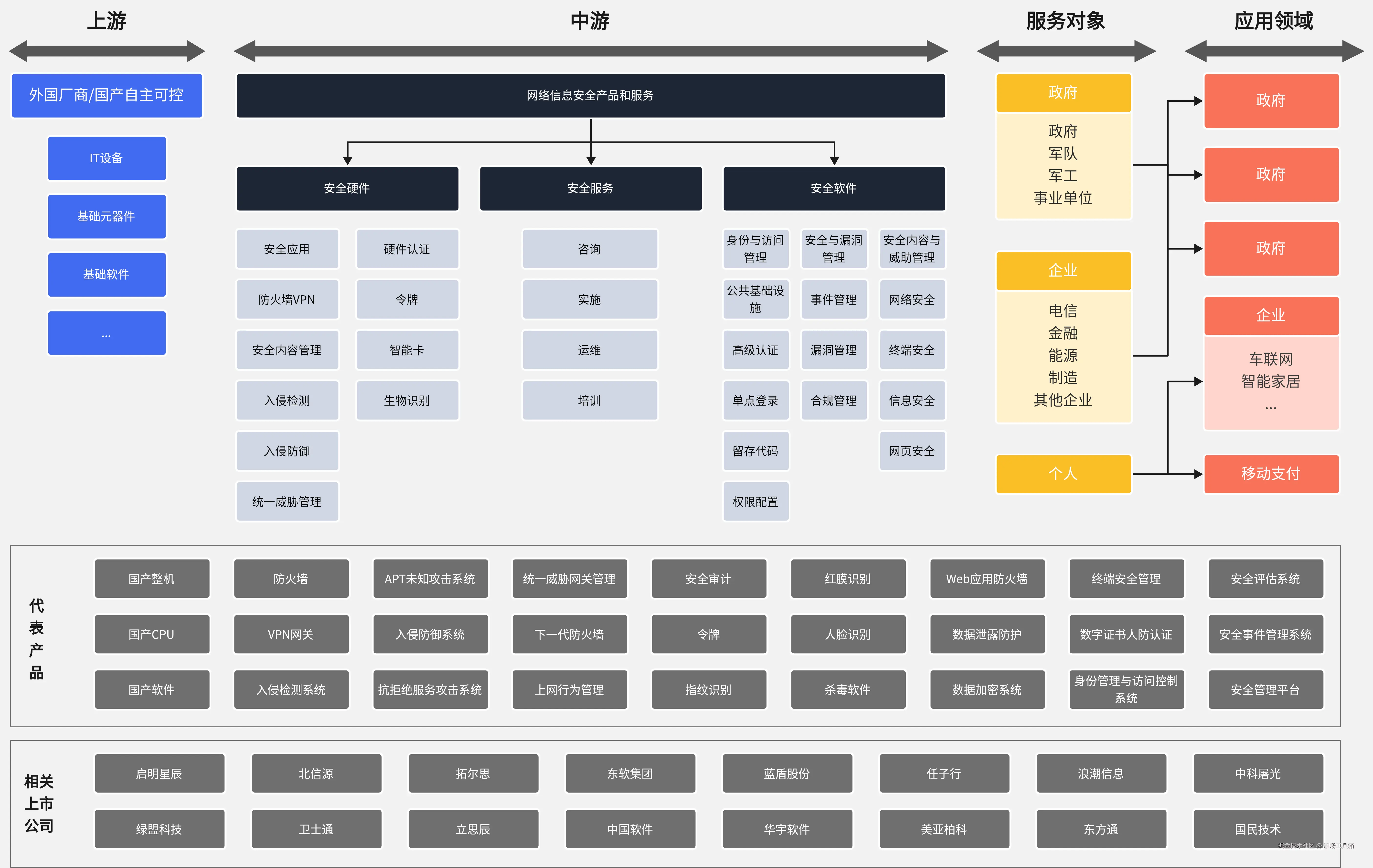 网络安全产业链框图展示了网络安全产业的整体生态系统,包括各个环节和参与方之间的关系。这个模板提供了网络安全产业生态系统的概览,包括各个环节和参与方的角色和关系,让人们了解网络安全产业的全貌。通过框图,可以清晰地分解网络安全产业的各个环节,有助于理解每个环节的功能和任务。