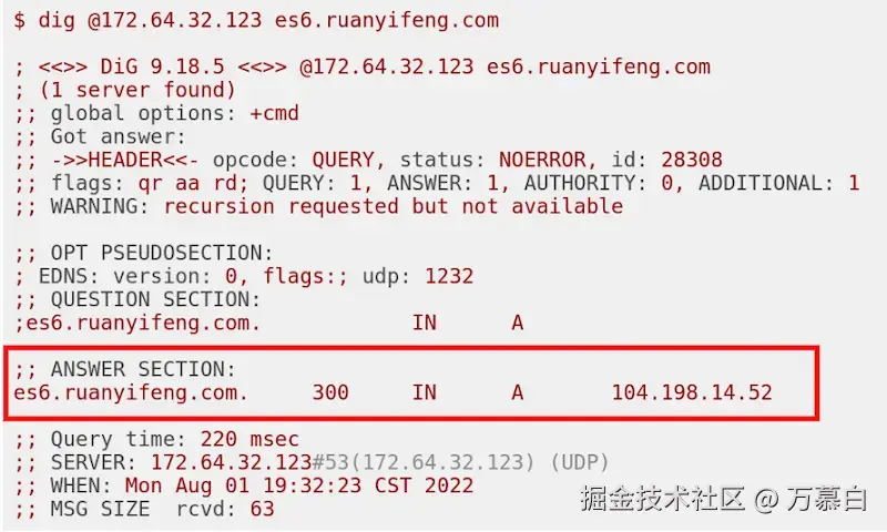 $ dig @172.64.32.123 es6.ruanyifeng.com