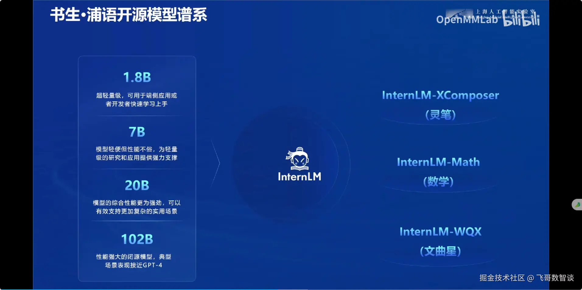 书生·浦语的开源模型谱系非常丰富,涵盖了从1.8B到102B的多种模型。这些模型不仅在性能上各有特点,还在应用场景上有所不同,满足了不同用户的需求。例如,小规模模型适用于端侧、学习,而大规模模型则适用于高性能要求的特殊场景。