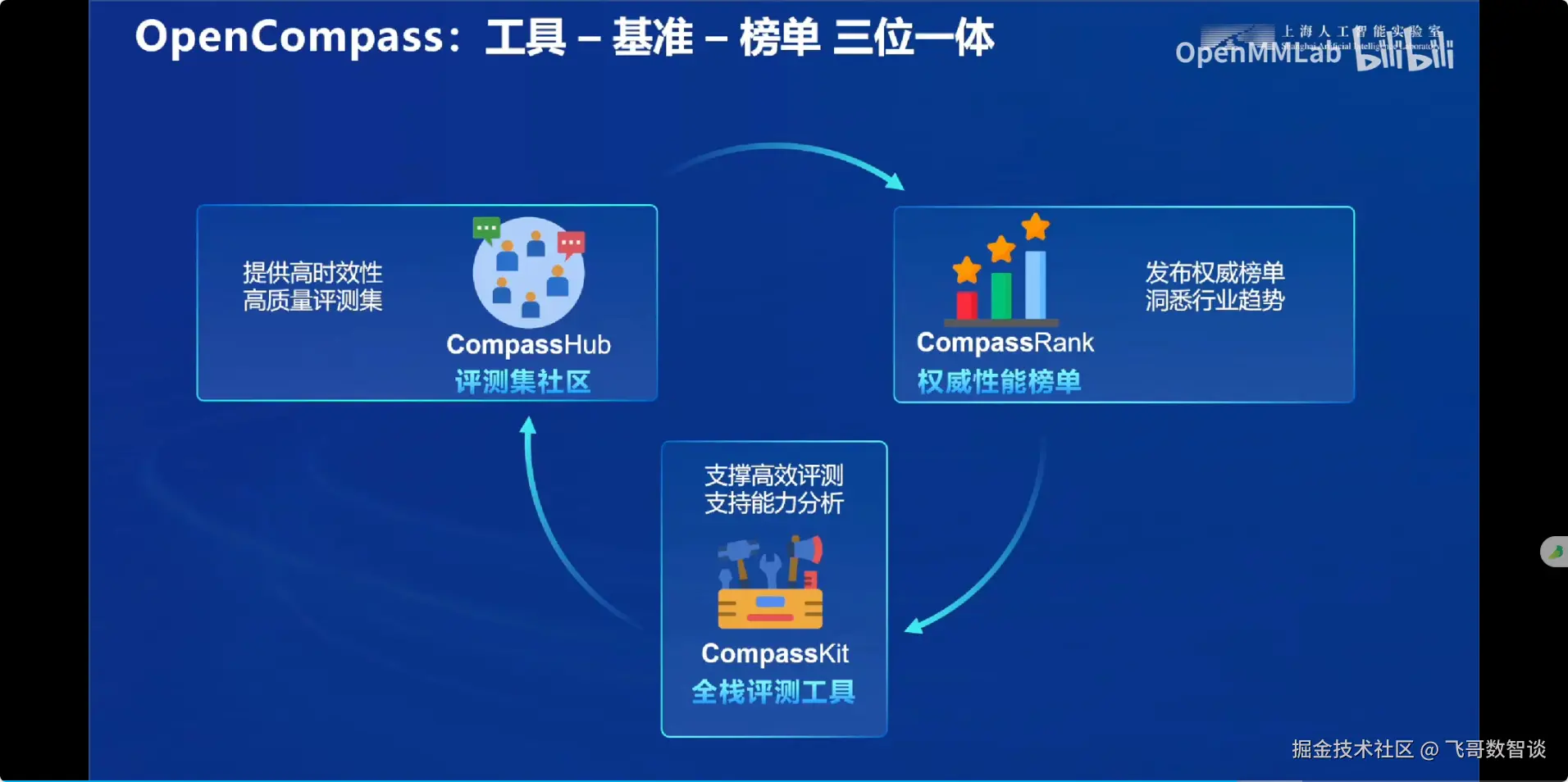 OpenCompass 是一个全面的模型评测体系,涵盖了多个评测指标和评测任务,达到了“工具-基准-榜单 三位一体”。