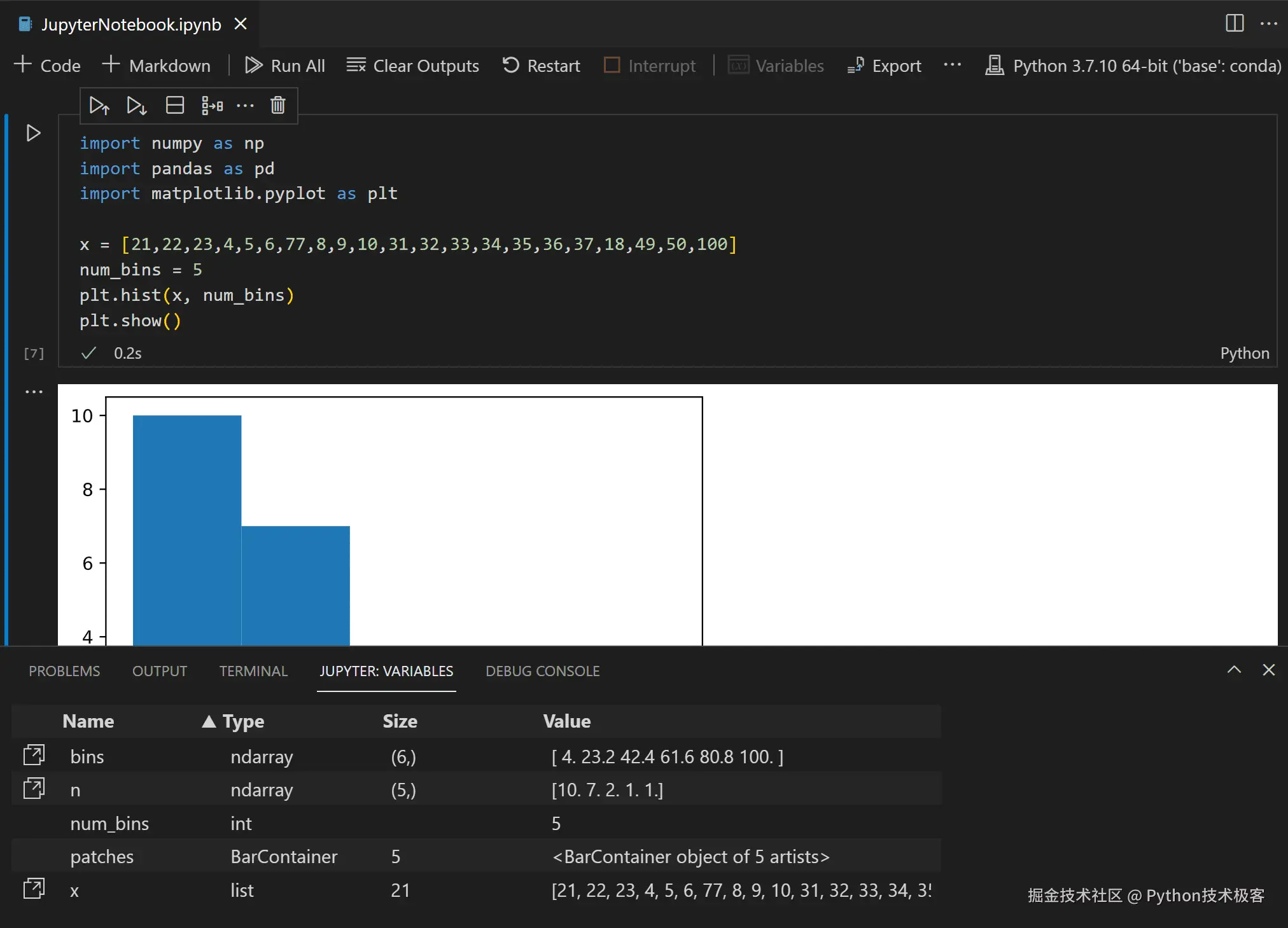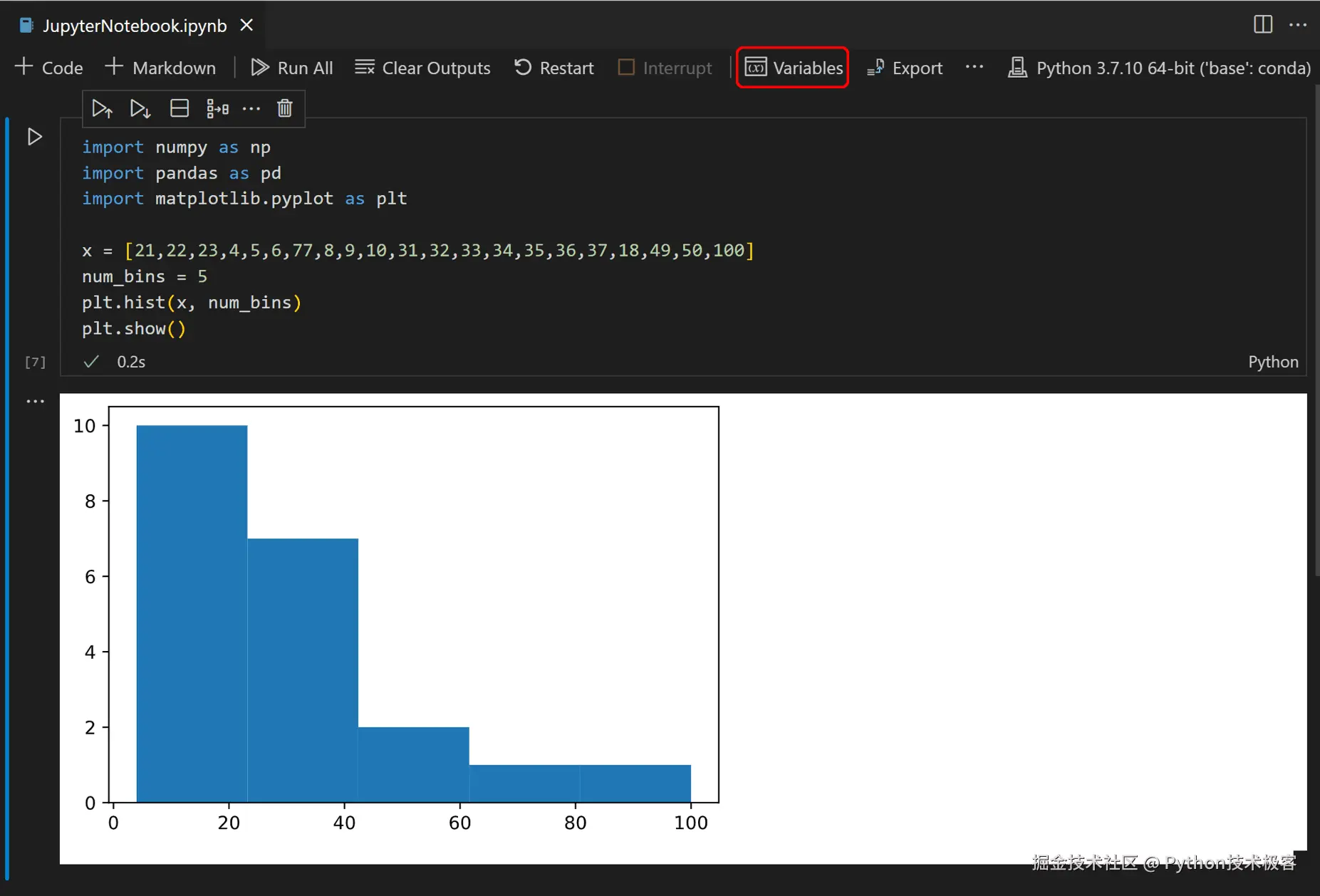 在 Python Notebook 中,可以查看、检查、排序和过滤当前 Jupyter 会话中的变量。运行代码和单元格后,通过选择主工具栏中的 “变量” 图标,您将看到当前变量的列表,该列表将在代码中使用变量时自动更新。变量窗格将在笔记本底部打开。