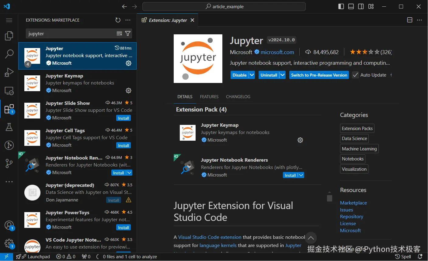 然后我们在 VSCode 中安装 Jupyter 插件,从而让 VSCode 可识别 ipynb 文件,以及运行调试 ipynb 类型的 Python 代码