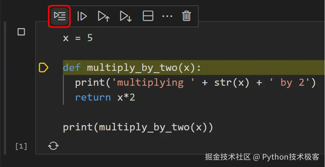 Run by Line 可让您一次执行一行单元格,而不会被其他 VSCode 调试功能分散注意力。首先,选择单元格工具栏中的 “按行运行”按钮: