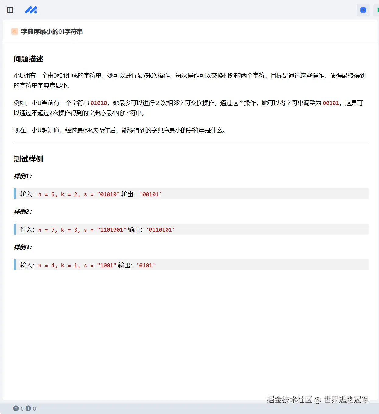你需要通过最多 k 次相邻字符交换操作,使得给定的由 0 和 1 组成的字符串 s 的字典序最小。字典序最小意味着字符串中的 0 应该尽可能地排在前面, 1 应该尽可能地排在后面。