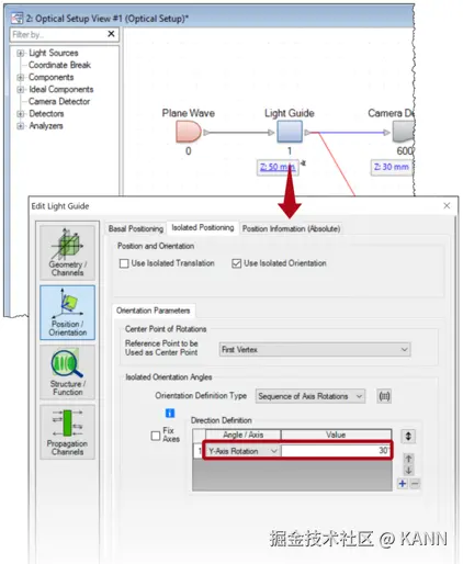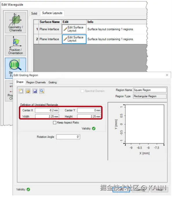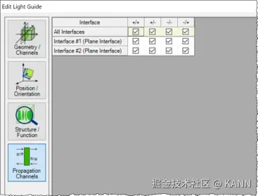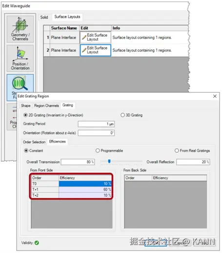 摘要 VirtualLab Fusion可以灵活地配置表面和(光栅)区域的通道。通过调整通道配置,可以轻松地实现所需的建模方案。我们使用一个具有两个表面的光波导的案例来演示通道的配置。显示了由不同的设置组合产生的光路结果。此外,我们还在光波导表面上添加了光栅区域,并演示了这些区域的通道配置,以及这些区域的光栅参数。 建模任务 如何调整表面上的通道和表面上的任何可能的光栅区域,以及如何用这些设置来控制仿真。 表面通道 初始化 使用两个平面表面创建一个由熔融石英制成的、厚度为5 mm的平面光波导。 使用两个平面表面创建一个由熔融石英制成的、厚度为5 mm的平面光波导。 为了更好地说明,定义光波导绕y轴旋转30°。 通道定义 每个表面有四个可选的通道,至少应该激活一个通道以进行追迹。 可以为每个表面单独定义通道。 不同的通道设置会导致不同的建模方案。 要更改“常规光学设置”中元件的通道,请将主菜单中的“Light Path Finder”部分的设置更改为“手动配置”。 要更改“常规光学设置”中元件的通道,请将主菜单中的“Light Path Finder”部分的设置更改为“手动配置”。  区域通道表面的区域 可以定义表面上的各个区域,并单独定义它们的光学特性,包括通道设置。 区域定义 在第一个表面上创建一个矩形区域。 将区域大小设置为2.25 mm×2.25 mm,其中心位置x方向设置为-3.6 mm。 在第一个表面上创建一个矩形区域。 将区域大小设置为2.25 mm×2.25 mm,其中心位置x方向设置为-3.6 mm。 将该区域定义为一个单透射级次T0 = 50 %和一个单反射级次R0 = 50 %的光栅,构成半反射镜。 在这里我们只处理零阶衍射,这与通常基于折射的透射和反射相同。 给出了从背面入射的效率;在这个例子中,T和R分别对应于-/-和-/+通道。 区域定义 按照与表面相同的规则设置该区域的通道。 区域定义 可以在一个给定的区域上定义一个衍射光栅。 区域定义 可以在一个给定的区域上定义一个衍射光栅。 我们在第二个表面上添加一个矩形区域(2.25 mm边长),中心位置沿x方向-8.2 mm 区域定义 可以在一个给定的区域上定义一个衍射光栅。 我们在第二个表面上添加另一个矩形区域(2.25 mm边长),中心位置沿x方向-8.2 mm。 定义一个理想的光栅,周期2µm,衍射效率为:T0=10%T+1=60%T+2=10% 区域定义 可以在一个给定的区域上定义一个衍射光栅。 我们在第二个表面上添加另一个矩形区域(2.25 mm边长),中心位置沿x方向-8.2 mm。 定义一个理想的光栅,周期2µm,衍射效率为:T0=10%T+1=60%T+2=10% 表面1区域: 打开-/+表面2区域: 打开+/+[包括T0、T+1、T+2衍射级次] 文档信息 拓展阅读 - 平板玻璃的非序列光线追迹分析- 平面或曲面标准具的建模- 统一多通道光波导外耦合光栅的优化 |
