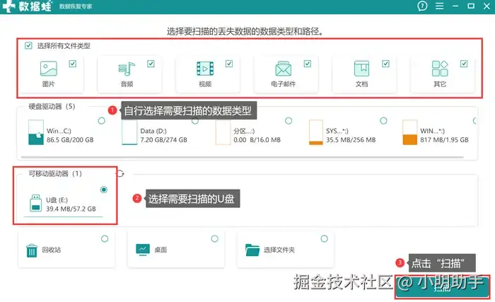 步骤1: 打开数据 蛙恢复专家,在软件的首页上选择自己需要进行恢复的数据类型;在U盘被电脑正确识别后,在软件首页上勾选上U盘作为扫描地方,选择完毕点击“扫描”。