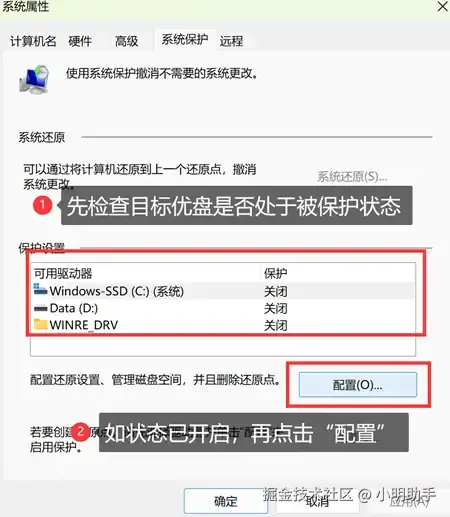 提示: 如果显示未开启,系统保护中就没有优盘丢失文件的副本哦。