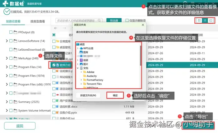 步骤2: 等待软件完成深度扫描后,再指定的位置选择自己需要恢复的文件,选中后点击“导出”。然后在“浏览文件夹”中选择恢复文件的存储位置。
