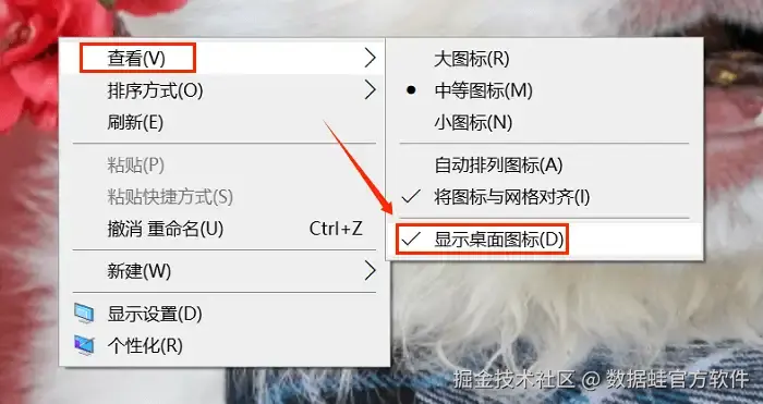 步骤2: 在 “查看” 的下拉菜单中,勾选 “显示桌面图标” 的选项。