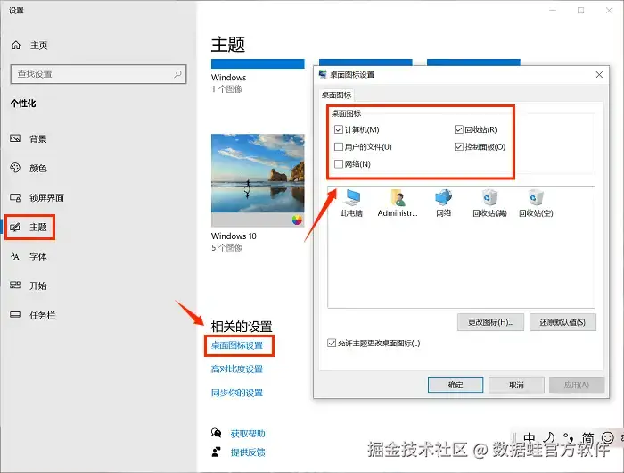 步骤2: 找到并点击 “主题” 选项。选择 “桌面图标设置” 。然后在弹出的 “桌面图标设置” 窗口中,勾选你想要显示在桌面上的图标,最后点击 “确定” 按钮就可以了。
