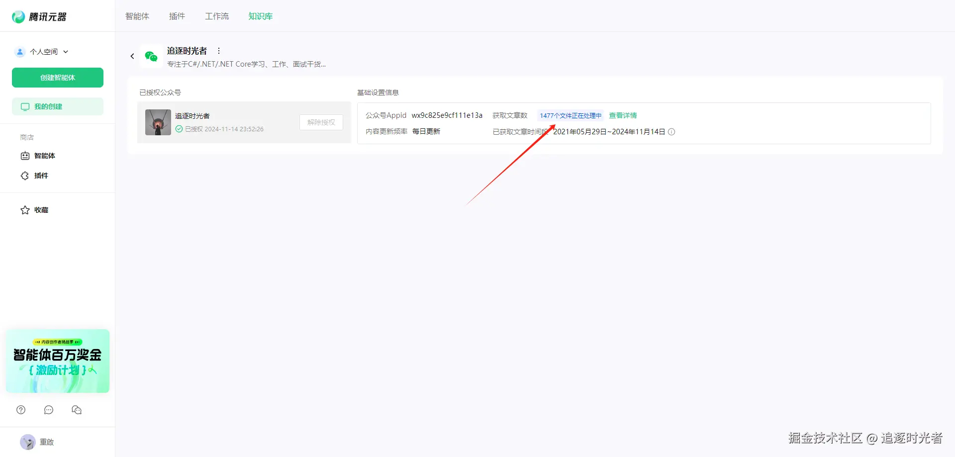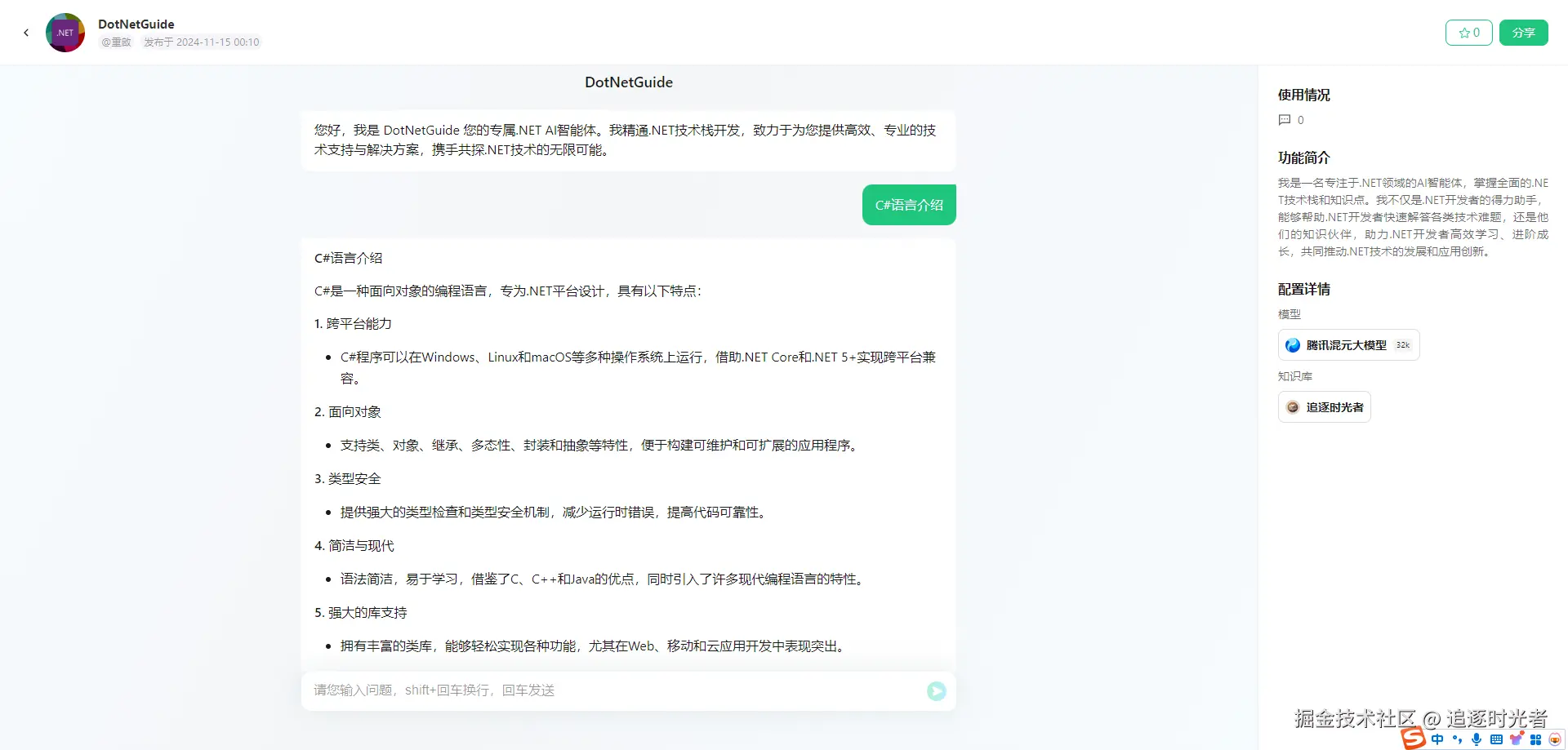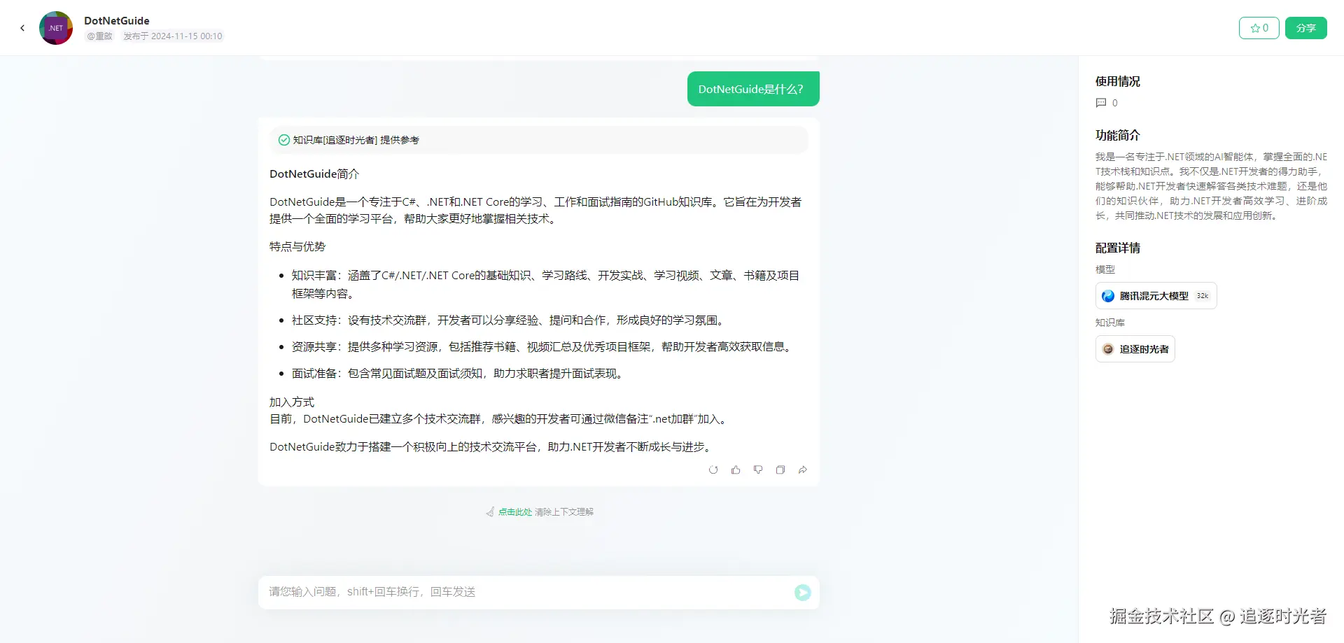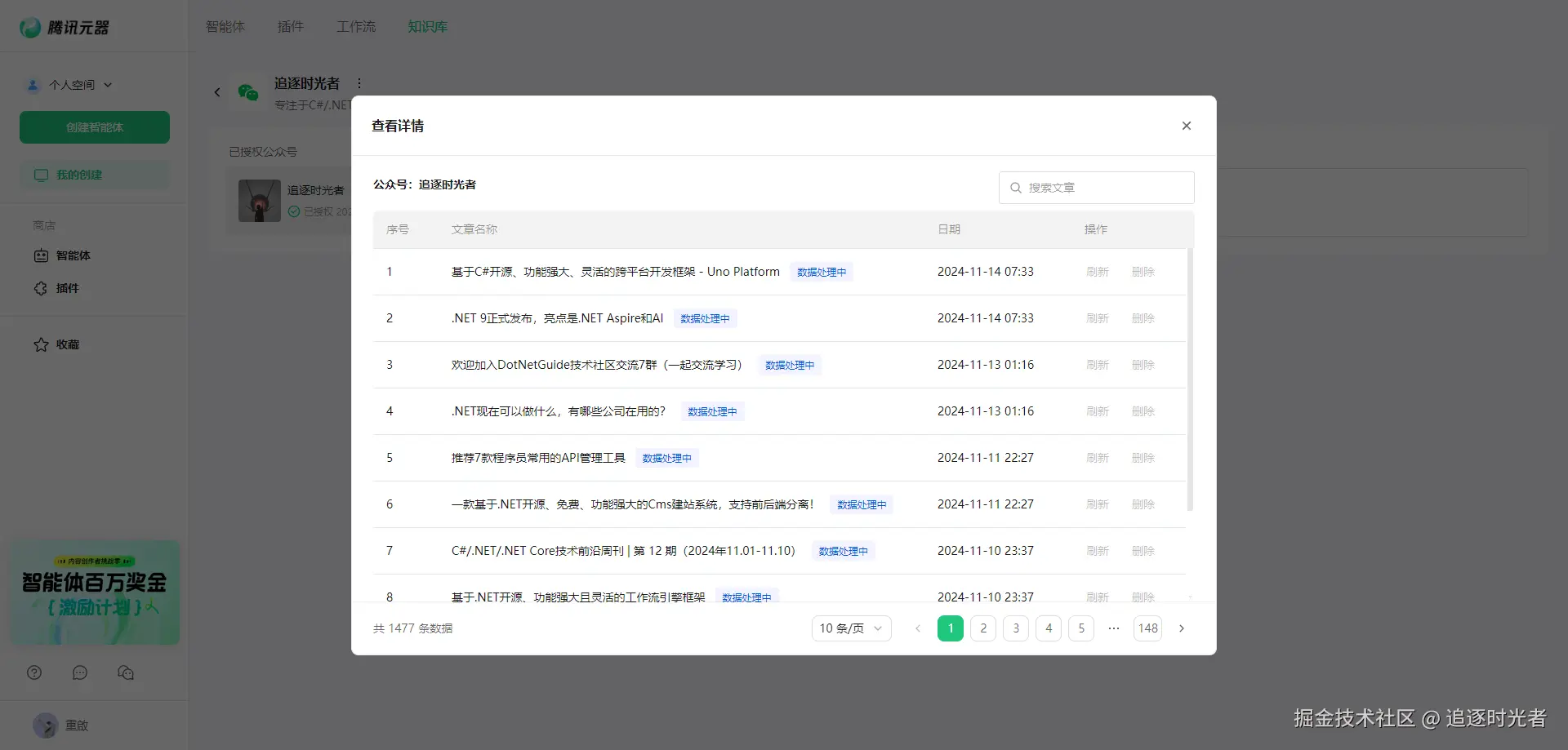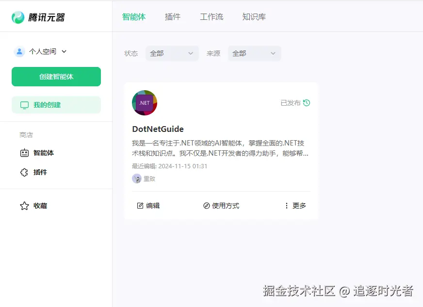 经常有粉丝朋友在公众号后台私信提问,因为个人平时比较少看公众号后台的私信所以没法及时回复。最近发现腾讯推出了一个可以创建和使用各种智能体的平台(帮助小白也能快速使用AI):腾讯元器,正好自己每天也在公众号更新.NET相关的文章(到目前为止.NET相关的文章应该有400多篇了)有着较为丰富.NET相关的知识库,因此今天我将利用腾讯元器,将我的公众号变身为一个强大的.NET AI智能体,造福我的.NET粉丝朋友们。