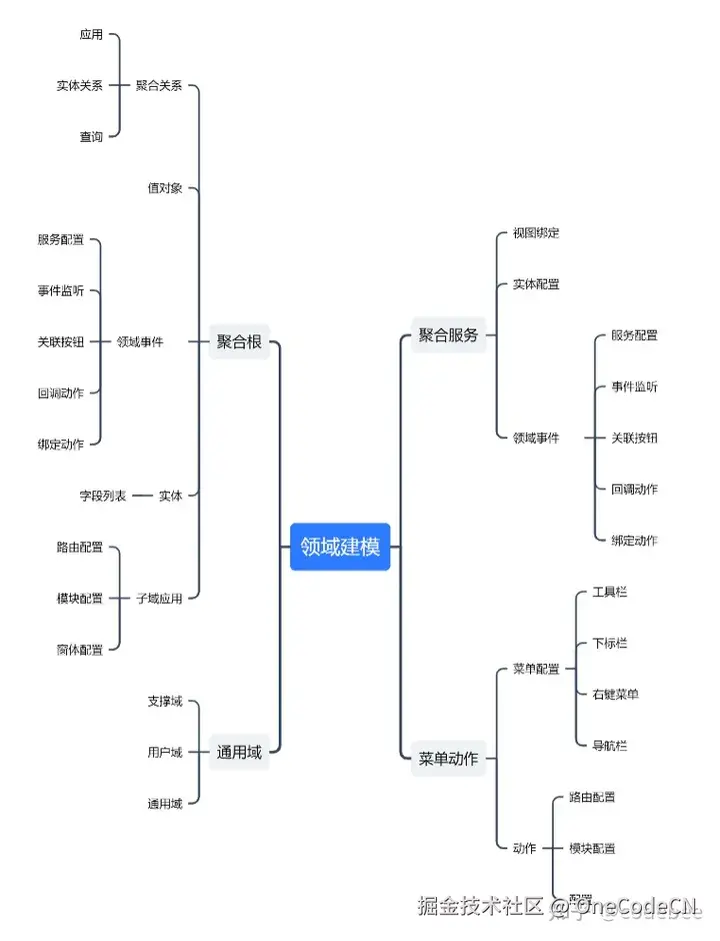 OneCode领域模型是基于DDD理论基础的一个通用低代码模型,总共分为了三个部分: