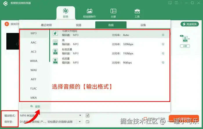 步骤2:选择音频的 【输出格式】 ,在其提供的格式列表中,根据自身需求,选择目标格式。