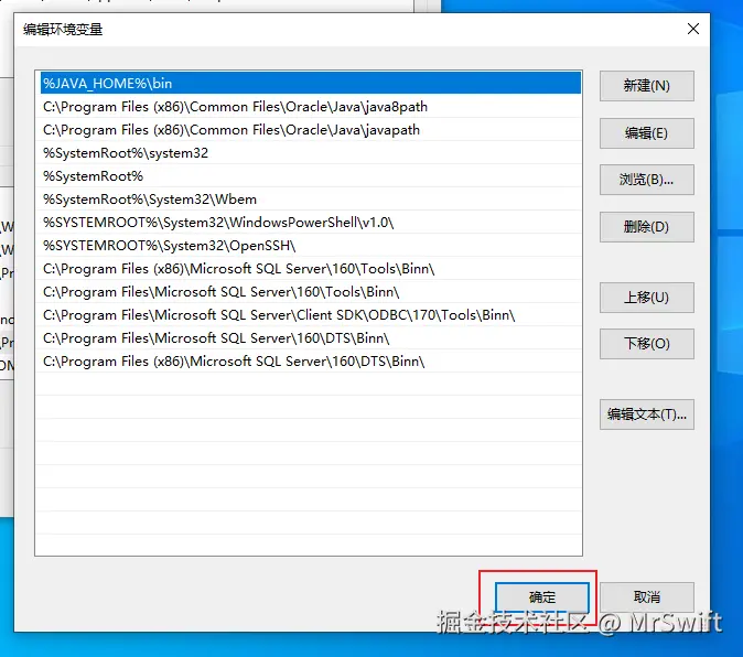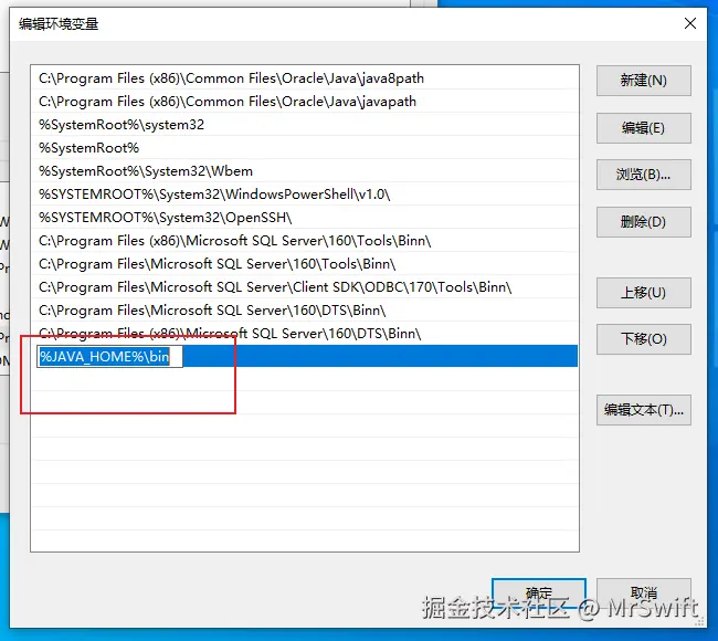 - 输入"%JAVA_HOME%\bin",字母大小写必须一致。