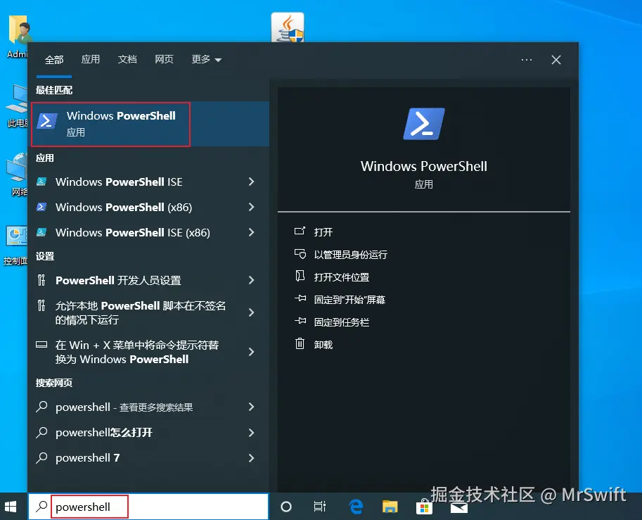 - 在桌面左下角搜索"powershell",打开windows的powershell工具