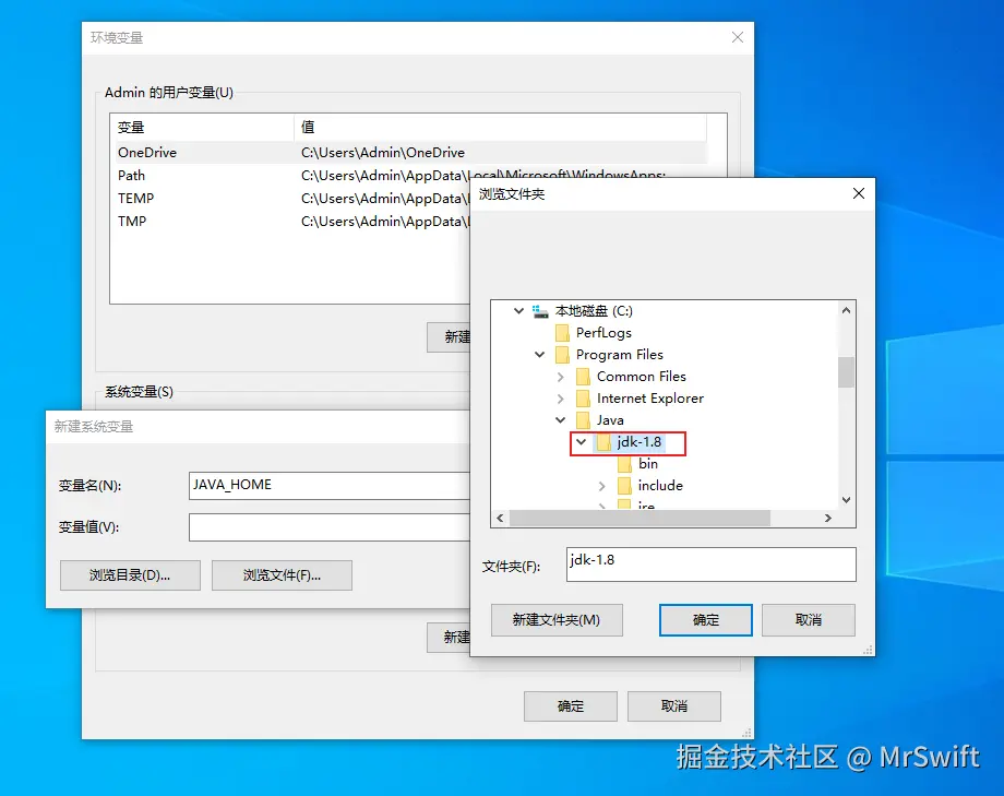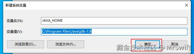 - 变量名填"JAVA_HOME",然后点击下方的"浏览目录",在弹出的窗口中选中之前的安装位置,选中后点"确定","变量值"的输入框就会自动填入值。路径一般为"C:\Program Files\Java\jdk-1.8",也可以直接将路径粘贴到"变量值"的输入框内