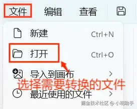 第二步: 打开软件后,点击界面左上角的【文件】按钮,点击【打开】,选择需要进行转换的图像文件。