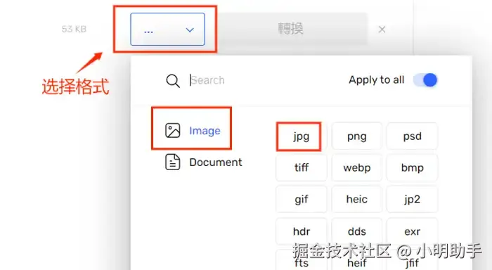 第四步: 点击有【···】号和向下指示号的白底框,选择【Image】(图片)中的jpg格式。