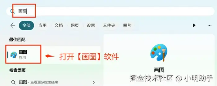 第一步: 点击【开始】菜单,在搜索栏中搜索【画图】并打开软件。