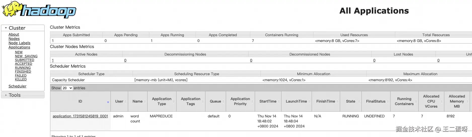 命令执行后,可以通过yarn的 web ui 或者控制台看到任务分发和执行。