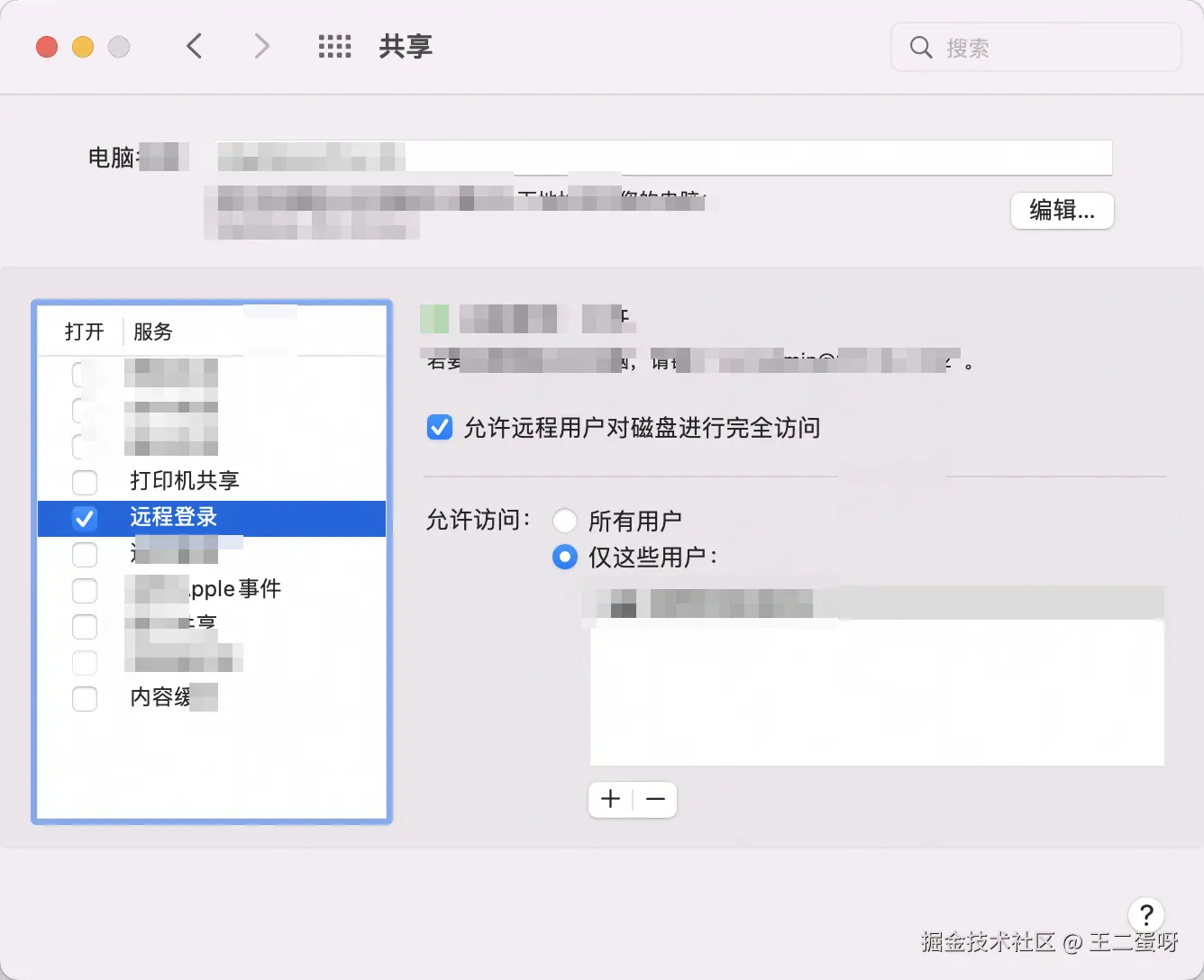 Hadoop是通过SSH进行节点间的通信和管理,所以各节点需要开启远程登录。以Mac系统为例,需要在下图中开启远程登录并且开启免密码登录。