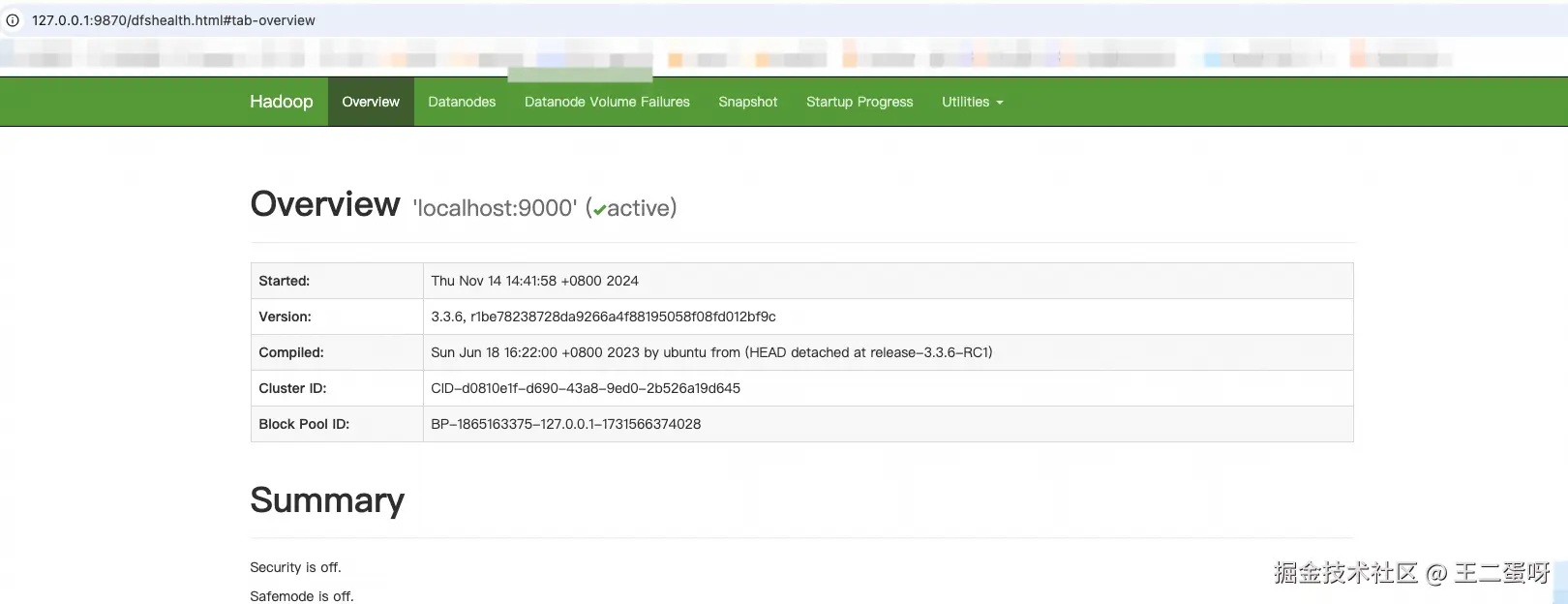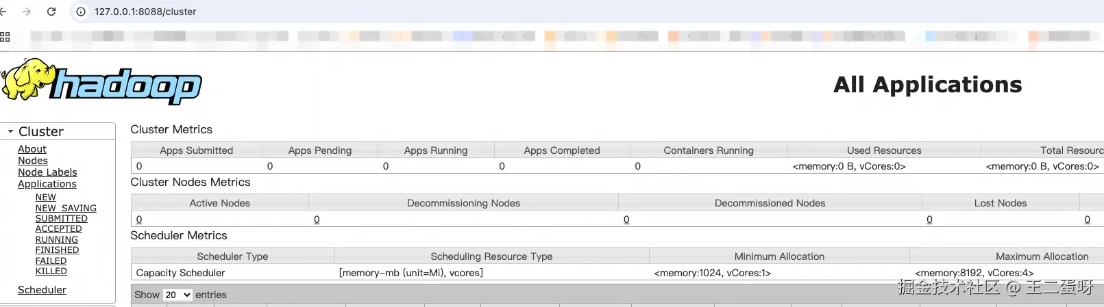 启动成功后分别通过127.0.0.1:9870 、127.0.0.1:8088 访问,Hadoop就算搭建完成了。