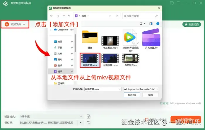 步骤1:在电脑设备上运行数据 蛙视频转换器,打开格式转换界面,点击 【添加文件】 并从本地文件中上传mkv视频文件。