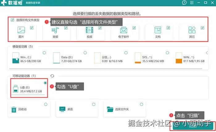 步骤1: 在将U盘和电脑进行正确连接后,再打开数据 蛙恢复专家进入软件的首页,在里面选择需要扫描的数据类型(为了让扫描结果更为全面,建议勾选“选择所有文件类型”),然后勾选U盘作为扫描位置后点“扫描”。