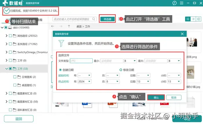 步骤2: 等待软件的一键深度扫描完成后,如果扫描出来的文件较多,则建议用户使用“筛选器”,按指示填写目标文件的相关信息后点击“确认”。