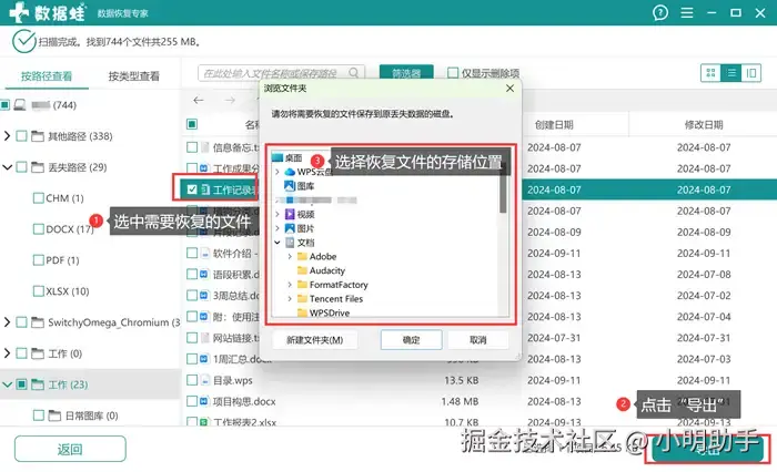 步骤3: 选中需要恢复的文件后,点击右下角的“导出”,然后再选择恢复文件的存放位置。