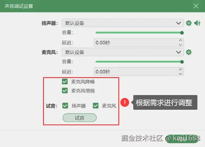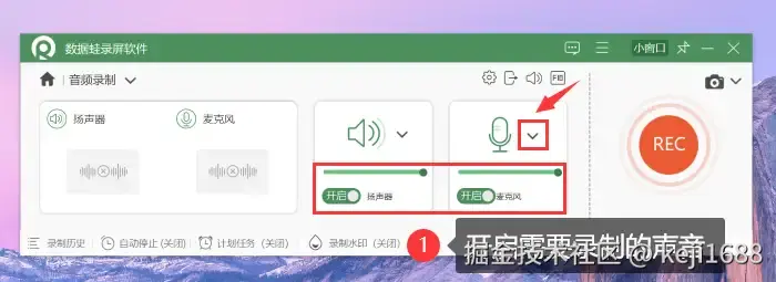 步骤2:在【音频录制】模式中,选择开启扬声器(录制电脑内部的声音)或麦克风(录制电脑外部的声音)。也可以点击进入 【声音调试设置】 中勾选麦克风增强或降噪,并进行试音操作。然后返回录制页面点击【REC】按钮开始录音。