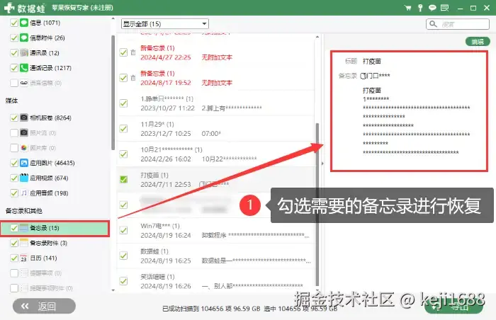 步骤3:扫描完成后,点击 【备忘录】 选项,勾选需要的备忘录进行恢复并导出保存到电脑上即可,完成备忘录的恢复。