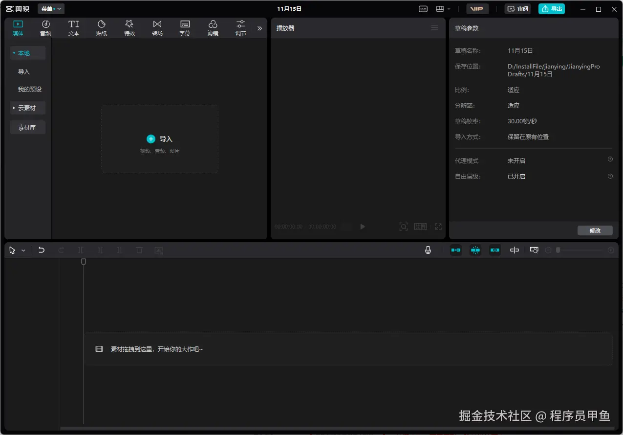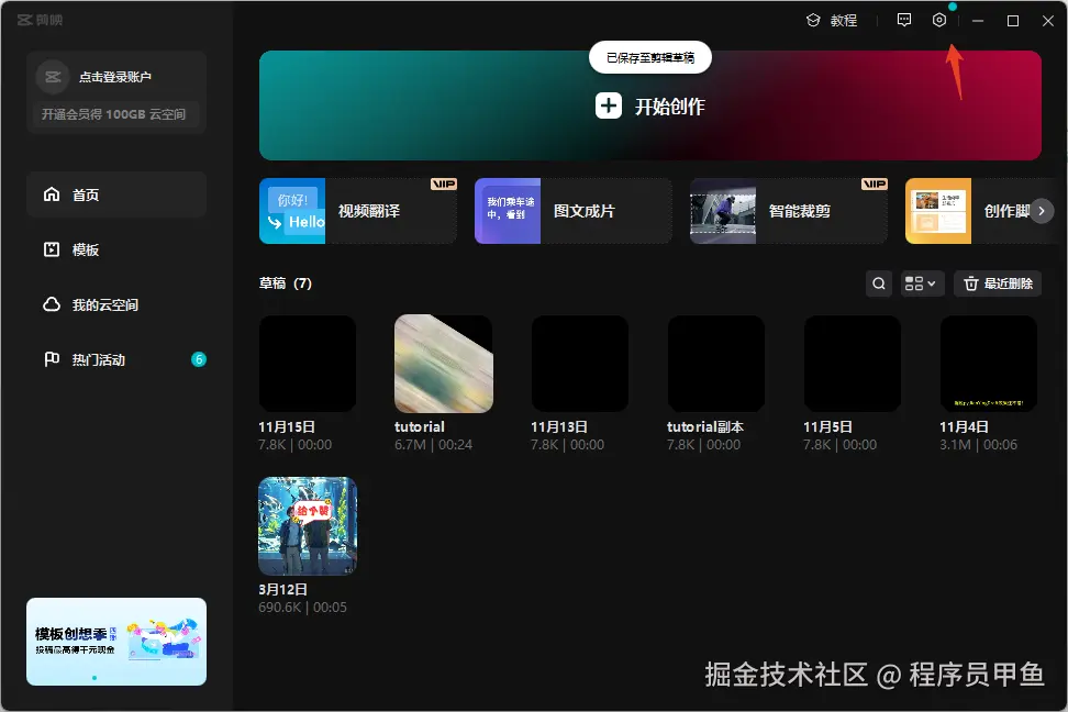 这个就是我们刚刚生成的空白剪映草稿11月15日。那这个草稿在哪找尼?我们需要打开剪映,点击设置