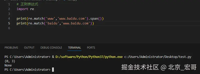 re.match 尝试从字符串的起始位置匹配一个模式,如果不是起始位置匹配成功的话,match()就返回none。