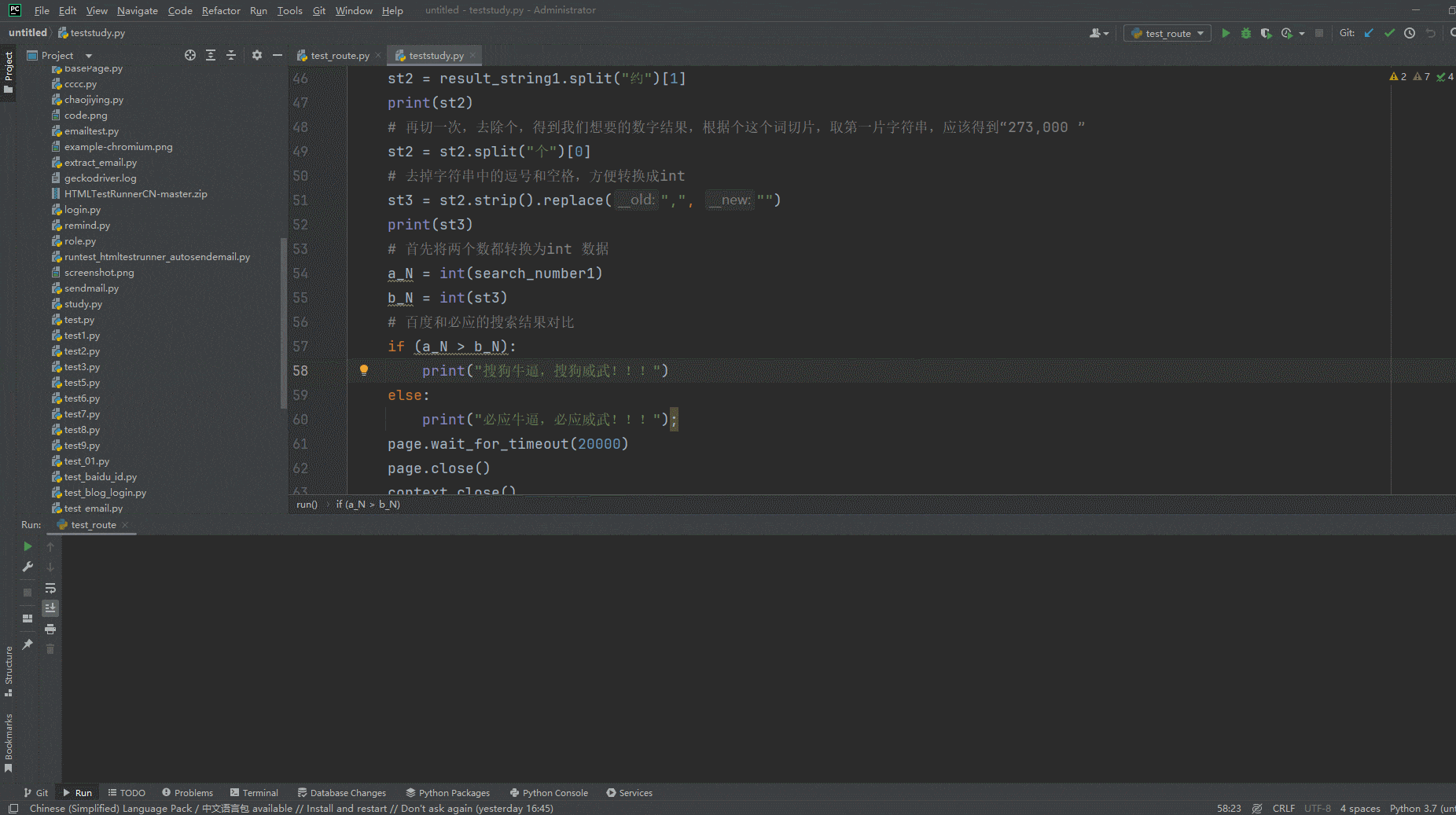 宏哥在这里说一下,自己的胡诌的测试场景哈,仅供学习和参考。然后按照宏哥说的进行自动化测试,测试场景:在度娘或者其他搜索引擎中搜索“北京宏哥”,然后搜索完毕,会返回搜索结果,告诉你搜索到多少个“北京宏哥”。宏哥这里分别用搜狗和必应搜索,然后对比她俩谁所搜到的“北京宏哥”多,然后通过对比说明谁的搜索能力强大(搜索结果多说明搜索能力强大)。