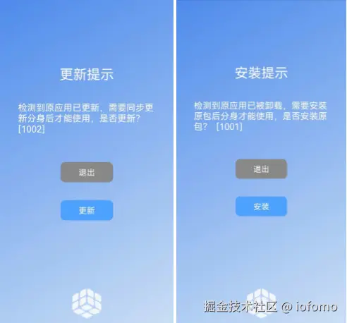 - 原应用版本发生变化(如升级到新版本),则分身应用会提醒要求同步更新后才能使用。