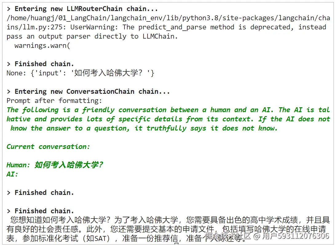 这三个测试,分别被路由到了三个不同的目标链,其中两个是我们预设的“专家类型”目标链,而第三个问题:如何考入哈佛大学?被模型一眼看穿,并不属于任何鲜花运营业务场景,路由链把它抛入了一个 “default chain” —— ConversationChain 去解决。