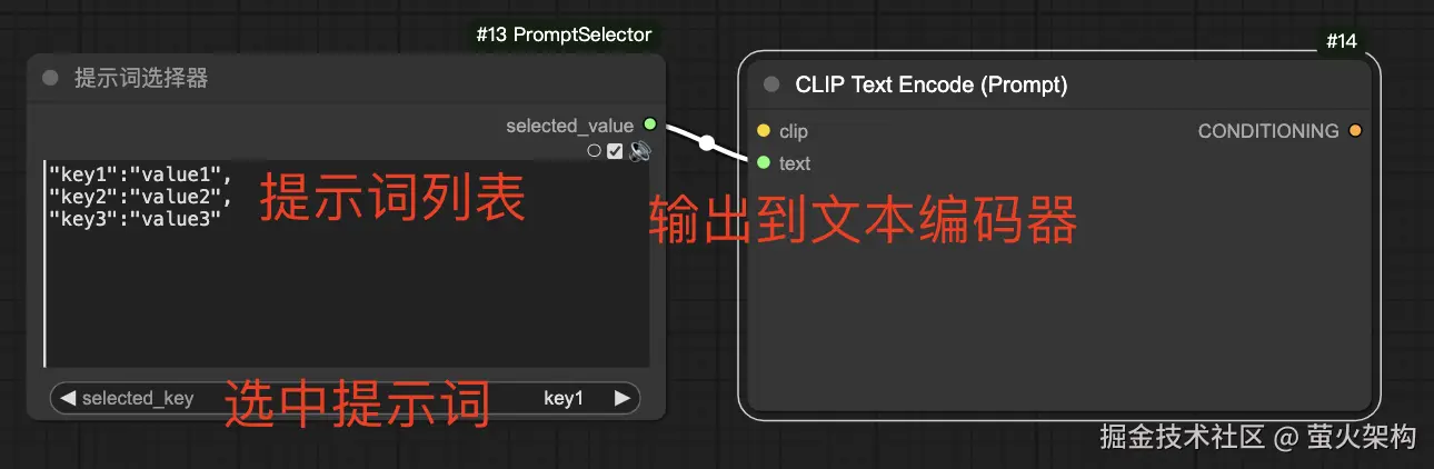 2、节点下方是一个下拉选择框,下拉列表根据上方输入的提示词自动填充,下拉选项是提示词的键;