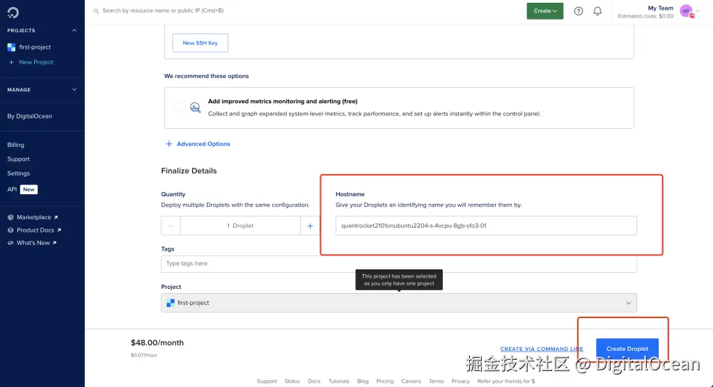 根据 QuantRocket 的系统要求,QuantRocket 的推荐配置是 16GB RAM 或以上。如果选择低于这个配置的服务器,就可能无法正常启动或使用该工具。所以在这里,我们选择基础型(Basic)Droplet,然后选择 Regular CPU中的 16GB 的配置,每个月仅需 96 美元。如果你需要性能最好的 CPU,那么可以选择旁边的 Premium Intel/Premium AMD。