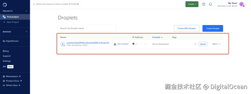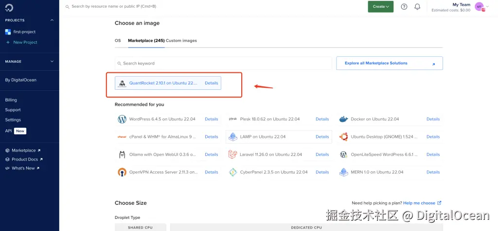 QuantRocket 官方推荐的是 DigitalOcean的 Droplet 服务器,一方面DigitalOcean 服务器的套餐在提供免费流量的同时,超额的流量费用仅需 0.01 美元/GB,比GCP、AWS 都要低。另一方面,DigitalOcean 提供了一键式部署的功能,用户只需要在 DigitalOcean 的后台点击几下即可创建一台带有 Linux 系统并部署了 QuantRocket 的服务器。