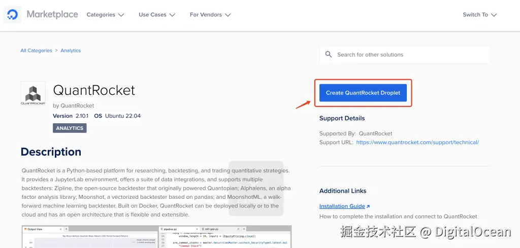 你就会看到下方截图的页面。在页面中,点击“Create QuantRocket Droplet”按钮即可。