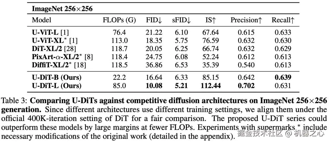 研究者们还进一步延长了训练的迭代次数,发现 U-DiT-L 在 600K 迭代时便能优于 DiT 在 7M 迭代时的无条件生成效果(表 4、图 2)。