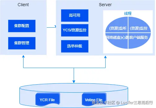 YCS 负责管理共享集群数据库,包括集群服务器配置管理,集群资源配置管理,启停、监控服务器以及资源,提供查询服务器资源拓扑状态能力,在各种故障时负责投票仲裁并重组集群。