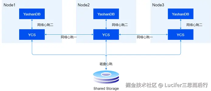 YCS 是高可用的关键部件,通过网络心跳和磁盘心跳来确认其他服务器以及服务器上运行的资源是否正常。监控任务感知到资源运行状态异常时,会进行投票仲裁决定允许留在集群中的幸存者列表,并通知所有服务器的所有资源采取必要的重组动作。