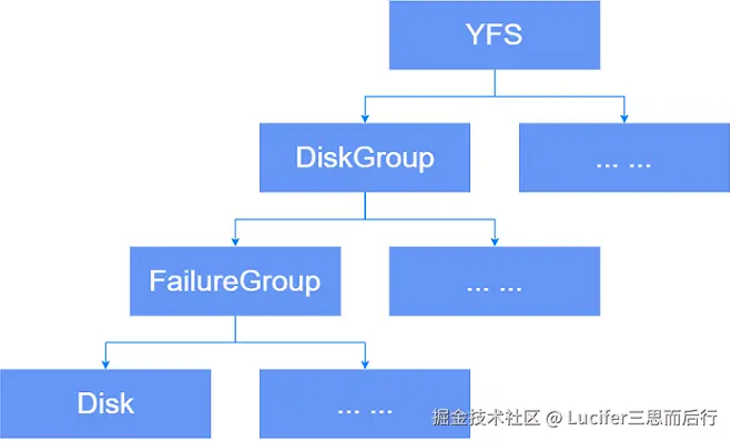 YFS 具备磁盘管理能力,将磁盘裸设备(disk)划分为磁盘组、故障组等逻辑概念,以层级结构管理。