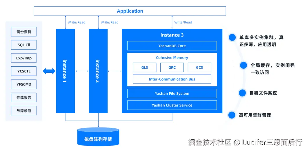 共享集群基于YashanDB内核持续演进,硬件上依赖共享存储实现shared-Disk的架构,同时引入了Cohesive Memory核心技术实现Shared-Cache能力,可在集群数据库多个实例之间协同数据页的读写访问以及各种非数据类资源的并发控制,主要特点包括: